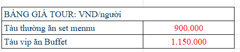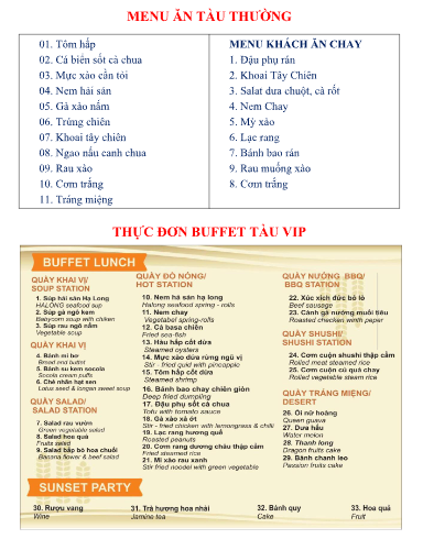 - 01 bữa trưa theo tiêu chuẩn trên tàu (tham khảo thực đơn cuối chương trình)